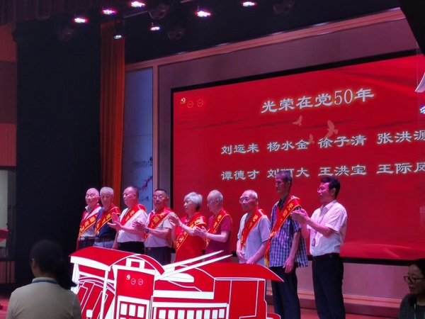 在第一个环节中,大会首先进行了新党员宣誓活动,4名师生新党员进行入党宣誓、老党员重温入党誓词。大会接着表彰了2020年度优秀党员与党员承诺先进,并为我校光荣在党50年的14名的同志颁发了纪念章。