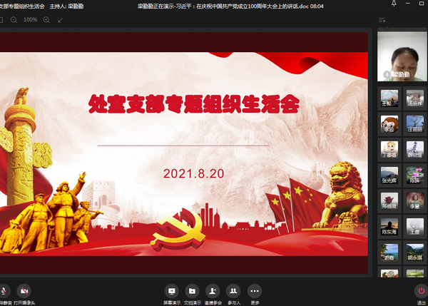 8月20日上午,处室党支部由支部书记梁勤勤主持,在企业微信上开展了线上专题组织生活会,校党委委员参加了本支部活动。